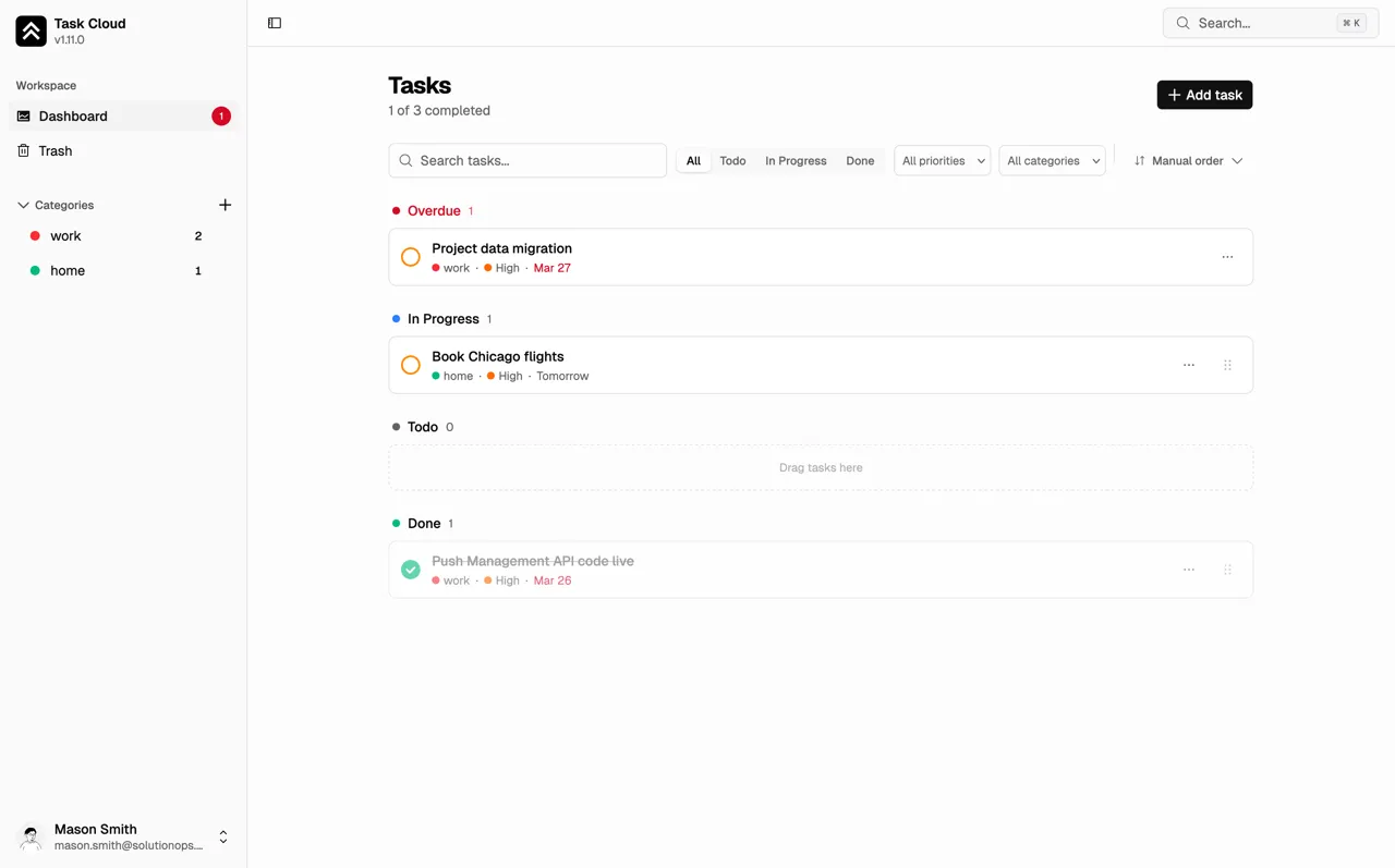 Most task apps try to do everything. This one does less, better. Clean categories, keyboard-first navigation, and nothing between you and your work. Every feature gets its own test environment with automated checks before anything touches production.